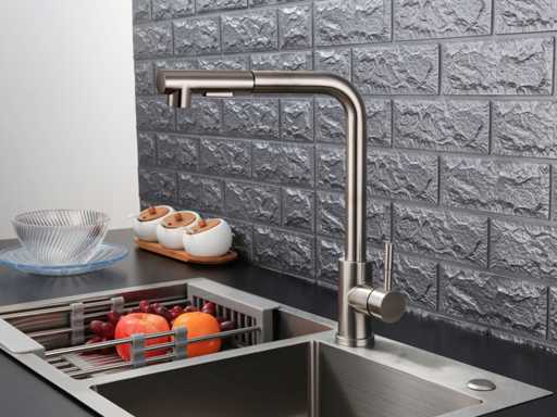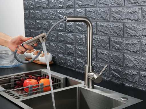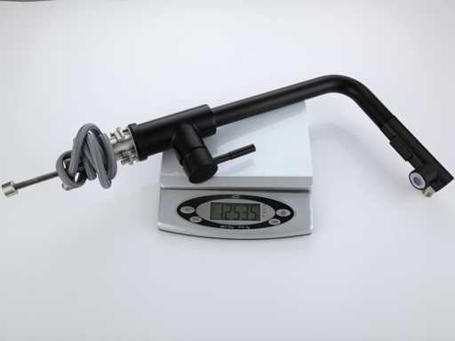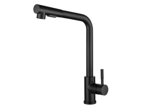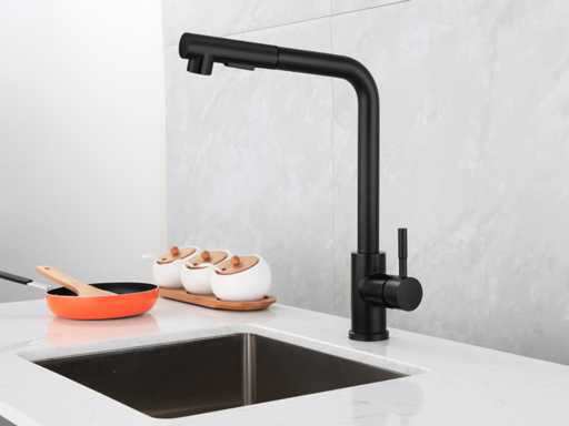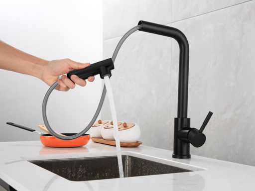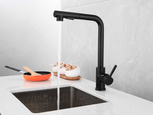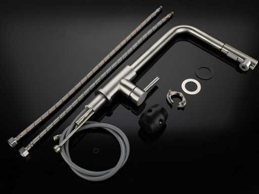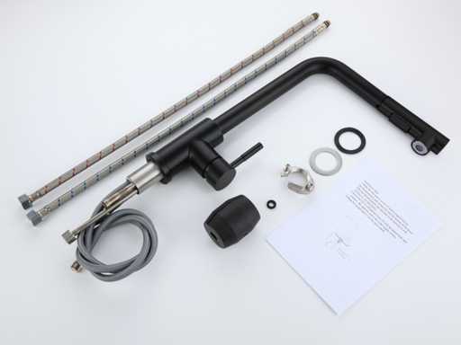 Kleurkeuze geborsteld RVS of Mat zwart, materiaal 304 rvs, hoogte circa 36 cm, gewicht 2kg, voorzien van sproeikop met 2 functies, uitloop 360 graden draaibaar, waterslangen met aansluitmateriaal, sproeikop uitneembaar met extra lange flexibele waterslang
