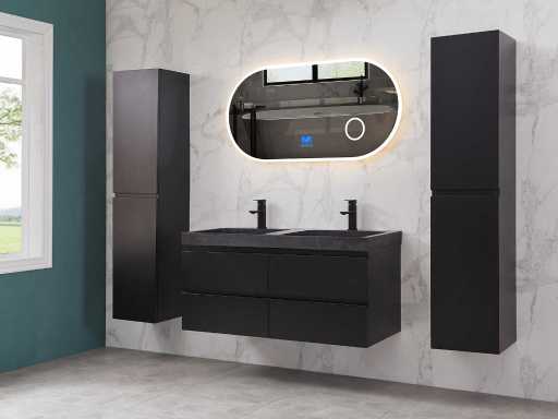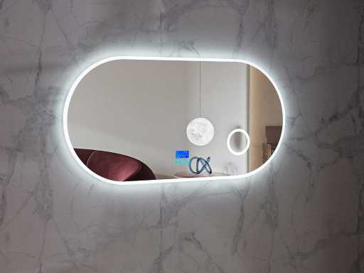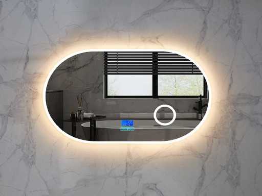 keuze uit 3 breedtes: 100 of 120 of 160cm, verwarming, bediening one-touch (voor heater, verlichting, bluetooth en instellingen), verlichting aan de voorkant met een lichtband en rondom aan de achterkant met een lichtdoorlatende acrylrand met 3 verstelbare en dimbare kleuren led 3000/4500/6000k led-dioden (geel/blauw/wit licht), voorzien van digitaal display, bluetooth met 2 speakers, digitale klok, temperatuur aanduiding, 220volt stekker(plug and play), geïntegreerde vergrotingsspiegel van 10cm doorsnede met ledverlichting (vergroot 3x), 1.5mm kopervrij glas met explosion-proof laag