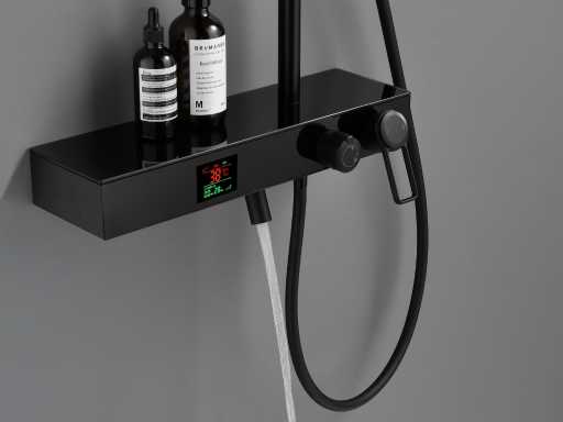 Temperatuur en tijdsduur digitaal afleesbaar. Keramisch binnenwerk. Badkraan uitloop. Gehard zwart glazen planchet op bovenkant regelunit.