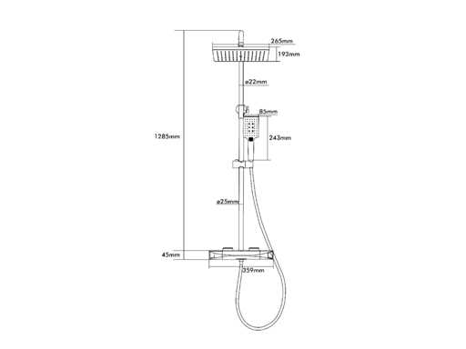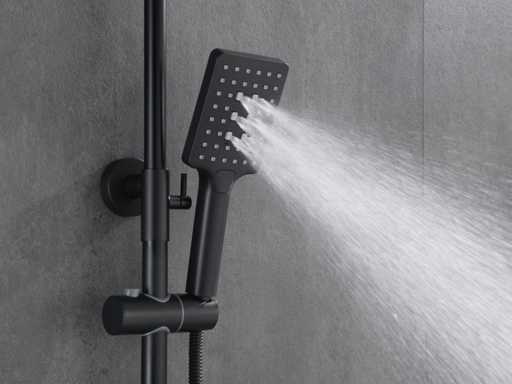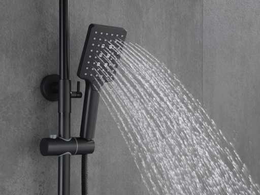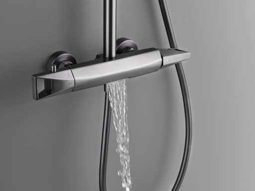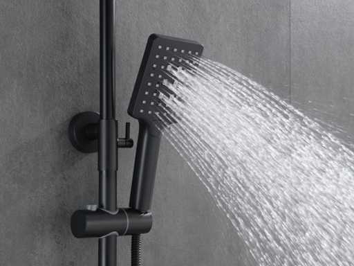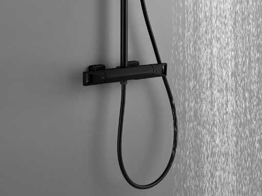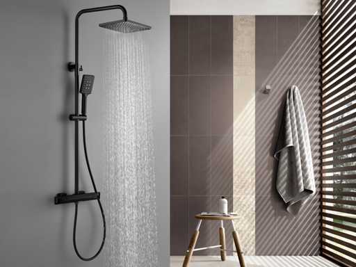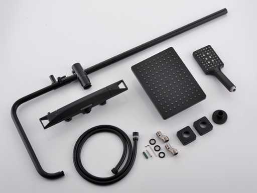 hoogte verstelbaar, materiaal aluminium en messing, kleur mat zwart, thermostaatkraan, binnenwerk keramisch, douchekop 26x20 cm doorsnede kantel/draaibaar, handdouche verstelbaar, keramisch binnenwerk, werking temperatuur 0 tot 90 graden celsius, anti kalk behandeld, badkraan uitloop, h.o.h. afstand van 150 mm