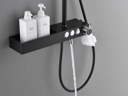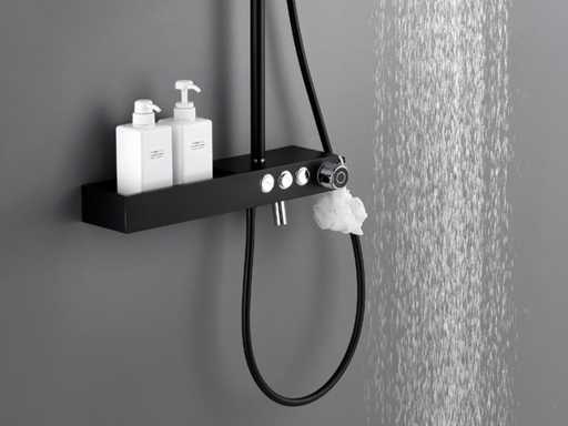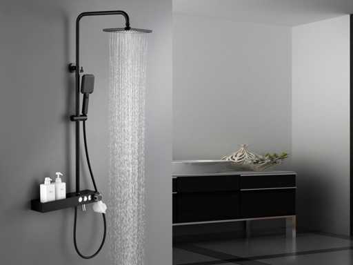 De doucheset is uitgerust met drie functies. De hoofddouche, handdouche (met twee standen) en een baduitloop. Deze functies worden afzonderlijk van elkaar gebruikt doormiddel van drukknoppen. Door de aanwezigheid van de baduitloop is deze doucheset ook geschikt voor douchebaden. De doucheset beschikt over keramische binnenwerken zodat je jarenlang plezier zult hebben van jouw regendoucheset. Doordat de doucheset in hoogte verstelbaar is past hij in vrijwel elke badkamer! De hartafstand van deze doucheset is 15cm. Materiaal: messing. Kleur: mat zwart (met chrome toetsen en baduitloop). Kraan: thermostaatkraan. Binnenwerk: keramisch. Douchekop: 26 x 20 cm. Handdouche: met 2 waterfuncties en doucheslang. In hoogte en draairichting verstelbare ophanging. Hoogte: verstelbaar. Voorzien van: 3 druktoetsen waarmee de 3 waterfuncties bediend kunnen worden. Douchekop met kunststof wateruitlopen om gemakkelijk kalkaanslag te verwijderen. Douchekop kantel en draaibaar. Keramisch binnenwerk. Bijzonderheden: h.o.h. afstand van 150mm.
