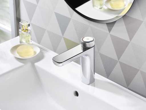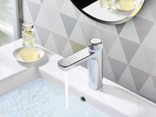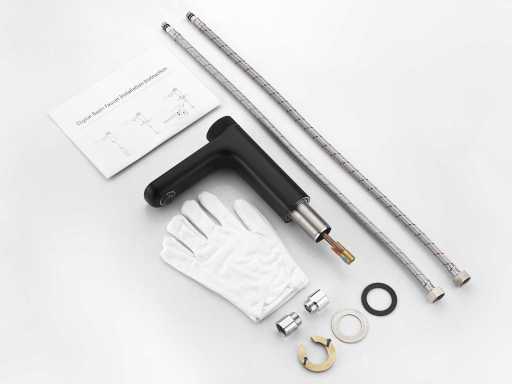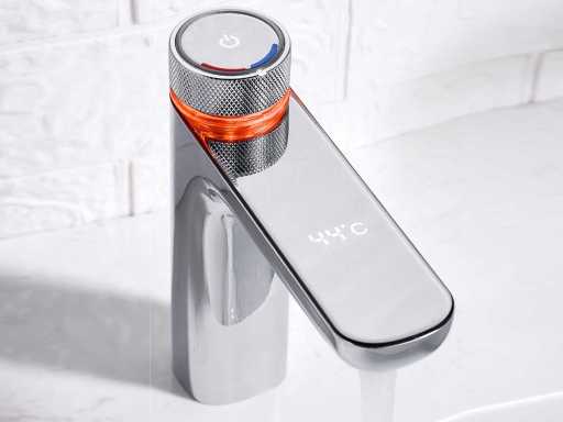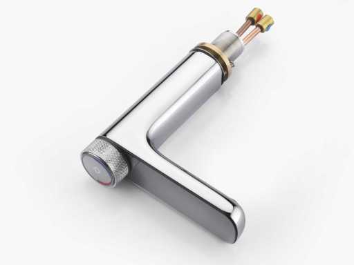 thermostaatkraan met keramisch binnenwerk, materiaal messing, hoogte 20 cm, voorzien van digitale micromotor aansturing door middel van waterflow, geen stroom/batterijen nodig, temperatuur digitaal afleesbaar en instelbaar, warm en koud waterslang meegeleverd