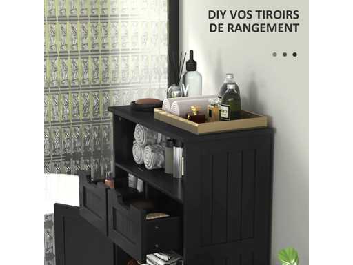 Specificaties: - Kleur: zwart - Hoofdmateriaal: MDF klasse E1 - Sun. totaal: 60L x 30B x 108,8H cm - Sun. niche: 54L x 27B x 18H cm - Sun. interne lades: 23,5L x 24,5W x 11H cm - Sun. Kastdeuren: 27L x 58,5L cm - Sun. Binnenkast: 54L x 27B x 59H cm - Sun. Plank: 54L x 25W cm - Beenhoogte: 6 cm - Aanbevolen maximale lading: 50 kg (totaal), 5 kg (per lade), 10 kg (per plank)