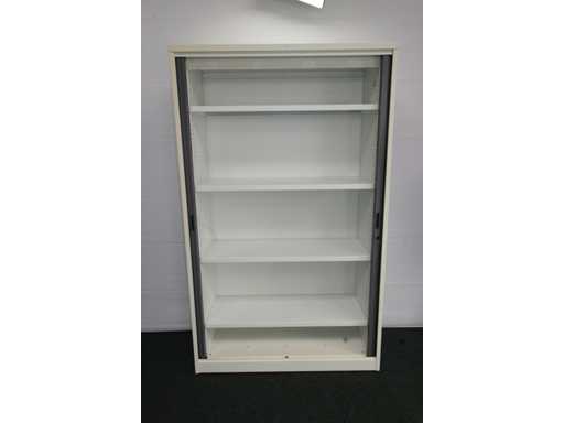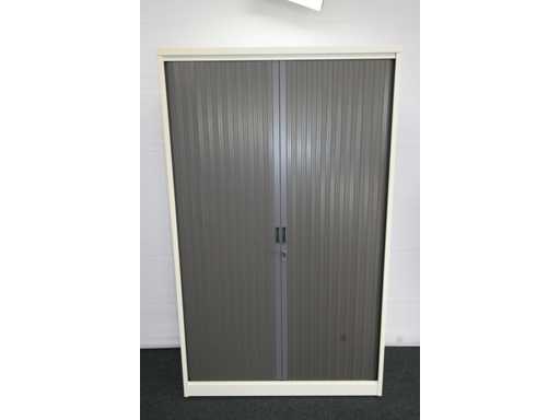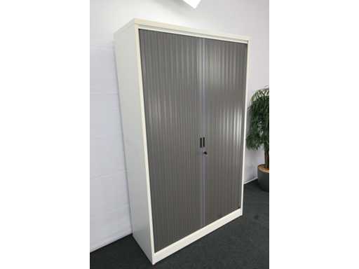 kast volledig in metaal kleur alu, rolluiken in kunststof kleur antraciet, uitgerust met 4 legplanken, afm. 1980 x 1200 x 470 mm (h x b x d), in goede staat enkel wat verkleuring door UV inwerking; foto's indicatief