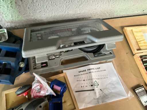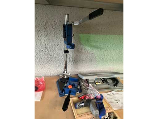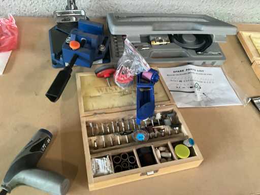 Model AT-3170 in opbergkoffer, compleet met toebehoren en manuele stand voor werktafel en draadloos multifunctionele werktool DREMEL 1100 en diverse accessoires.