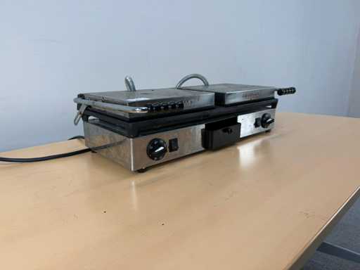 Professionele dubbele contactgrill van Milan Toasti, geschikt voor intensief gebruik in horeca-omgevingen zoals broodjeszaken, lunchbars en keukens. Uitgevoerd met twee afzonderlijke bakzones, elk met eigen temperatuurregeling.