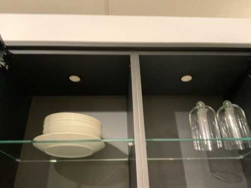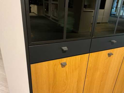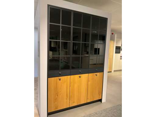 indeling: 3 onderkasten; 3 laden en 3 opzetkasten met glasdeur; elk met 3 glazen legplanken; push-to-open; verlichting; LET OP: door koper zelf ter plaatse nog te demonteren; zonder de getoonde accessoires