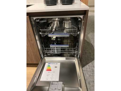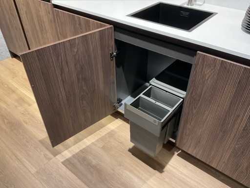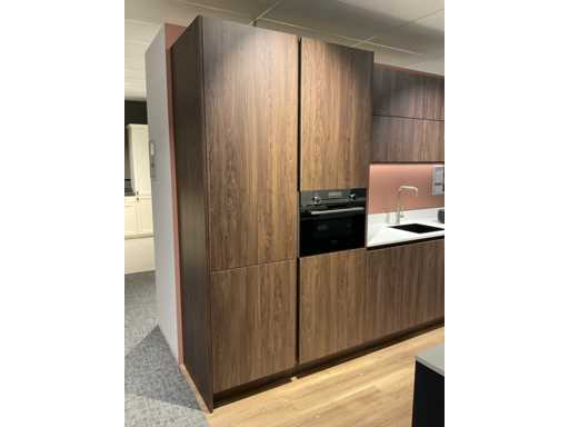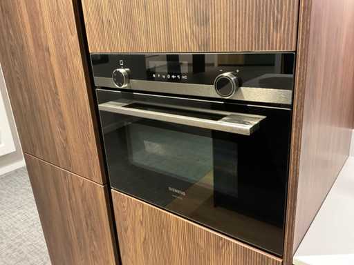 Kookeiland met zitdeel; indeling: 2 ladenkasten waarvan 1 met binnenlade met bestekinzet; en 1 onderkast; Siemens inbouw inductie kookplaat; type EH631HEB1E; 60 cm breed; Siemens eilandafzuigkap; type LF97BCP50; indeling wandopstelling: 2 onderkasten waarvan 1 met afvalemmer; 2 hoge kasten; 2 bovenkasten met klepdeur; verlichting en touchdimmer; Siemens inbouwoven met magnetron; type CM485AGB0; inhoud 44 liter; Siemens inbouw koelvriescombinatie; type KI86V5SEO; inhoud 183/84 liter; Siemens inbouw vaatwasser; type SN63E804BE; 13 couverts; Scan de QR code voor meer informatie; LET OP: door koper zelf ter plaatse nog te demonteren; zonder de getoonde accessoires