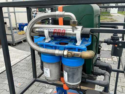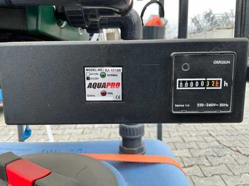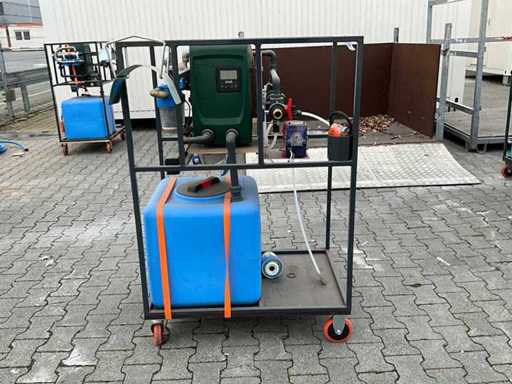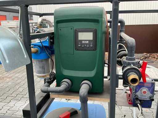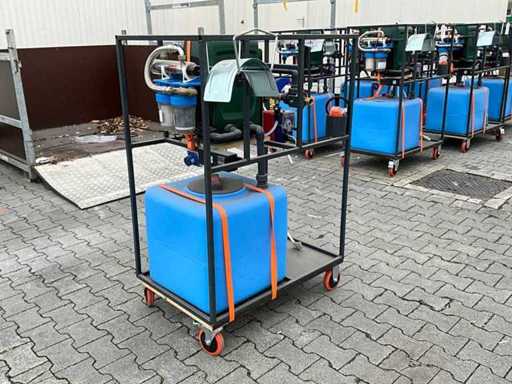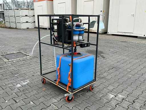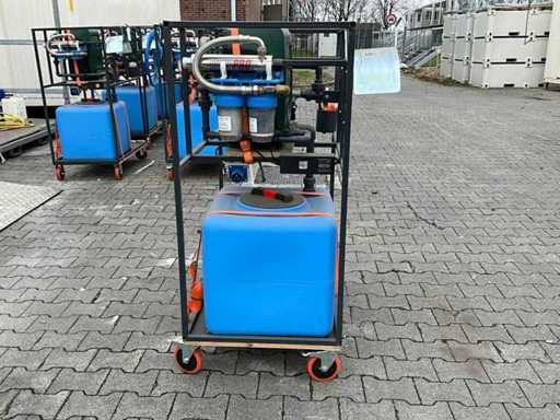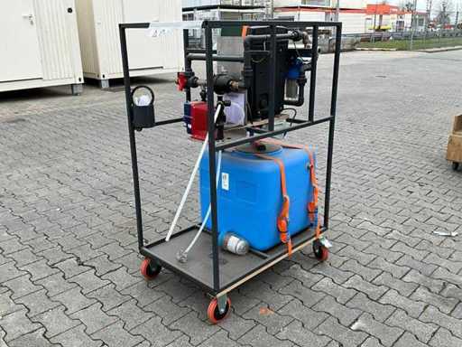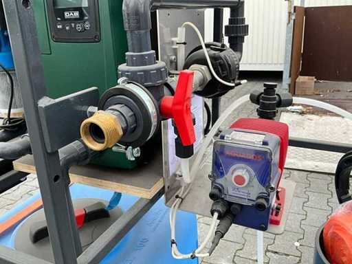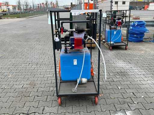 gemonteerd in profielstaal verrijdbaar staal frame; voorzien van AquaPro UV waterfilter; afgelezen urenstand 1 uur; doseerpomp Aquados; hydrofoorpomp DAB E.Sybox; kunststof vloeistoftank capaciteit 100 liter; 230 Volt; ten behoeve van legionella bestrijding; ongebruikt;
