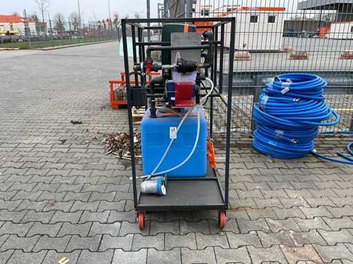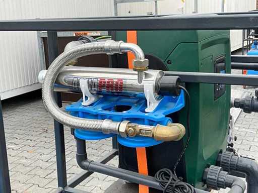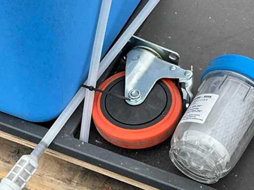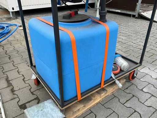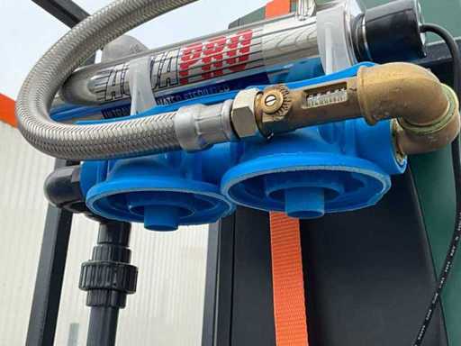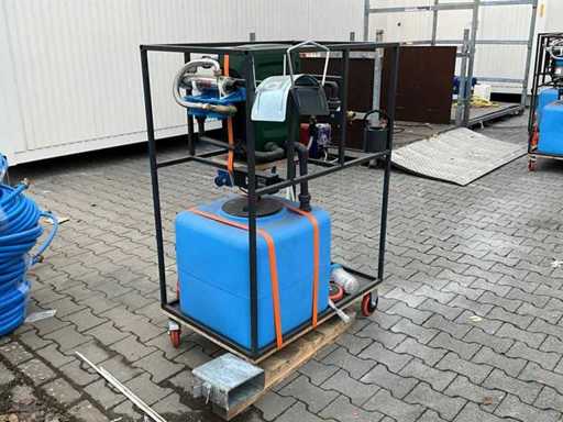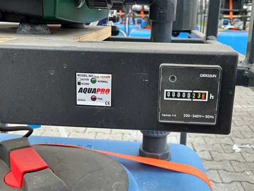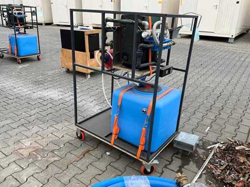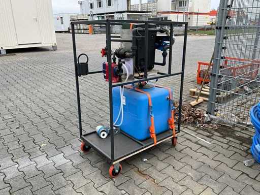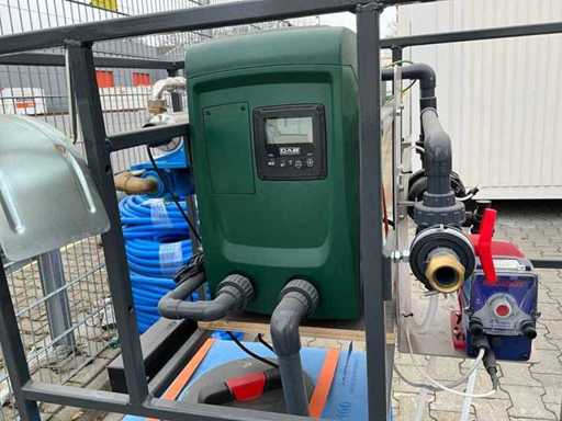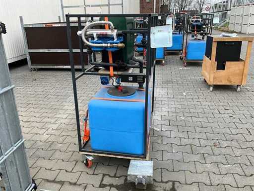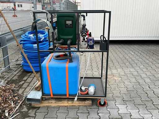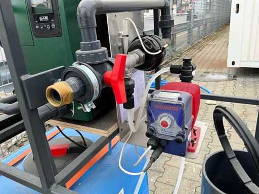 gemonteerd in profielstaal verrijdbaar staal frame; voorzien van AquaPro UV waterfilter; 2x zonder filterglas; filterglas behuizing beschadigd; afgelezen urenstand 1 uur; doseerpomp Aquados; hydrofoorpomp DAB E.Sybox; kunststof vloeistoftank capaciteit 100 liter; 230 Volt; ten behoeve van legionella bestrijding; ongebruikt; 1x wiel te herstellen;