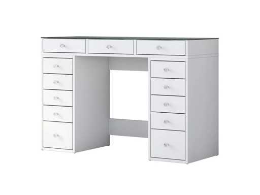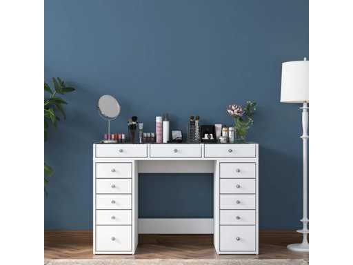 Productbeschrijving: Deze make-up kaptafel is geschikt voor woonkamers en slaapkamers. Het bevat aan beide zijden meerdere opberglades. Het is gemaakt van melaminespaanplaat. De afmetingen zijn 120 cm breed, 79,8 cm hoog en 44,5 cm diep.