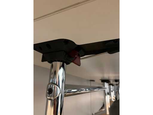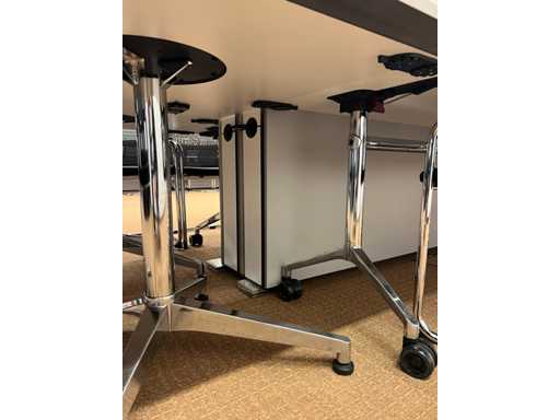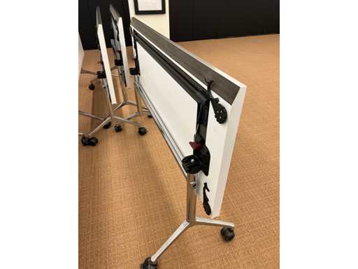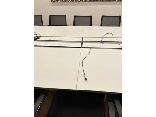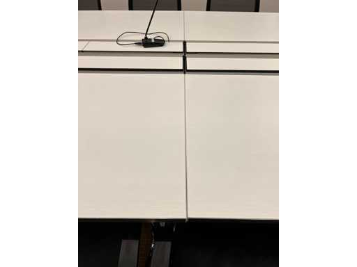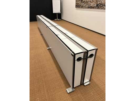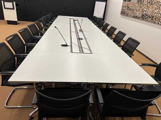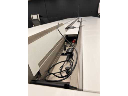 Modulaire vergadertafel, uitgevoerd in wit generfd MDF met aluminium rand en onderstel. De tafel is verrijdbaar en opklapbaar, wat flexibiliteit biedt bij het inrichten van vergaderruimtes. Voorzien van geïntegreerd speakersysteem en elektro-/internetaansluitingen. (L565 x B170 x H74 cm) Gebruikssporen mogelijk
