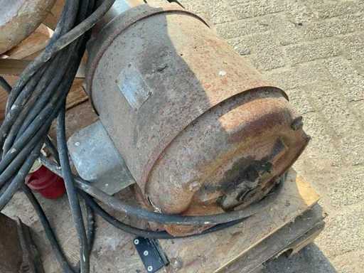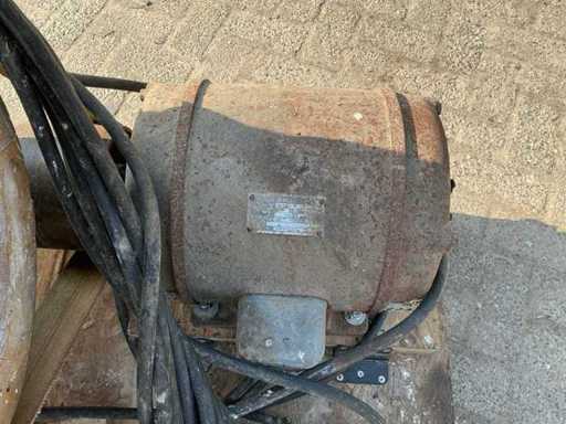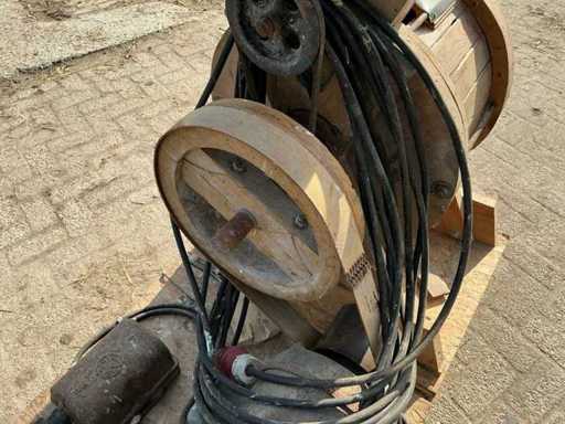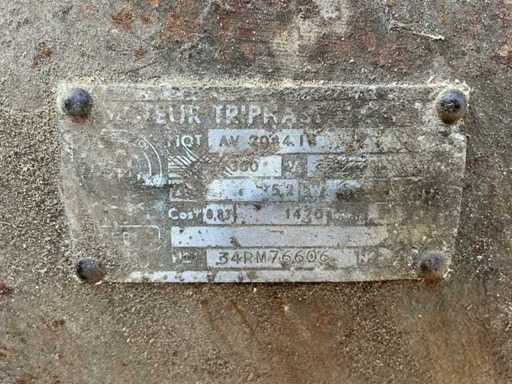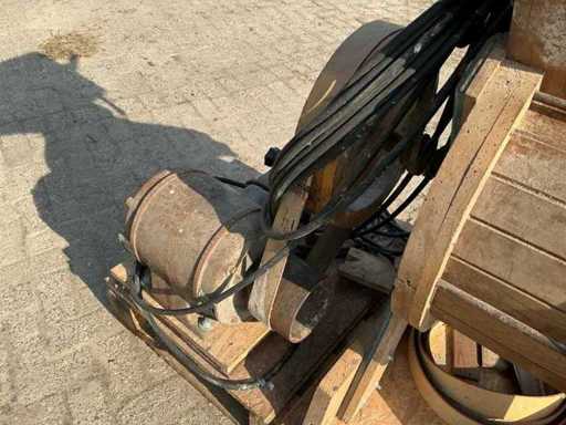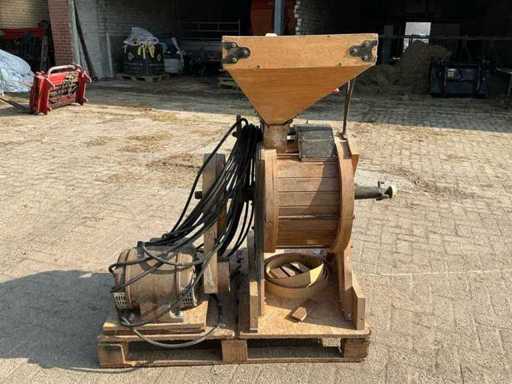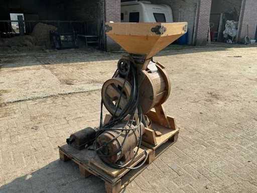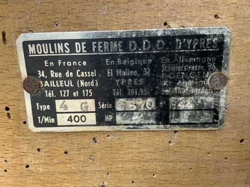 Voorzien van: Moulins de Ferme D.D.D. d’Ypres graanmolen/hamermolen type 4C, serie CB70, met elektrisch aangedreven motor van 3 HP (ca. 2,2 kW), toerental 400 t/min, geschikt voor het malen van graan en veevoeder, vervaardigd door D.D.D. d’Ypres (België/Frankrijk/Duitsland).