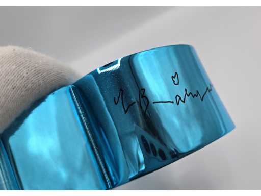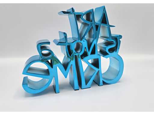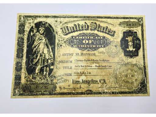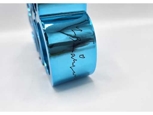 "Art Is Not a Crime (Chrome Blue)" is een limited edition hars sculptuur van Mr. Brainwash, genummerd en met de hand gesigneerd door de kunstenaar. Inclusief certificaat van echtheid. Geschatte afmetingen 8 "x 6.5" x 2".