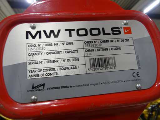 bestaande uit portaalkraan MW Tools PTLK3, bouwjaar: 2020, hoogte: 2400-3600mm, breedte: 2860mm, met MW Tools HNSJ3030 takel, capaciteit: 3 ton, bouwjaar: 2022