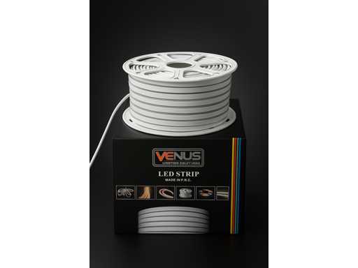 2 x 50 meter Neon LED Strip - Geschikt voor gebruik binnen en buiten - IP-waarde: IP65 (dicht) - Spanning: 220-240 V (50/60 Hz) - Lengte: 50 meter - LED-type: SMD 2835 - Vermogen: 8W per meter - Aantal LED's: 120 per meter - Kleur: zwart-wit groen - Dubbelzijdig: verlichting aan beide zijden - Lichtopbrengst: 80 lumen perR meter - Beamingshoek: 120° - Levensduur: 30.000 uur - Inclusief 3 gratis stopcontacten - Direct klaar voor gebruik