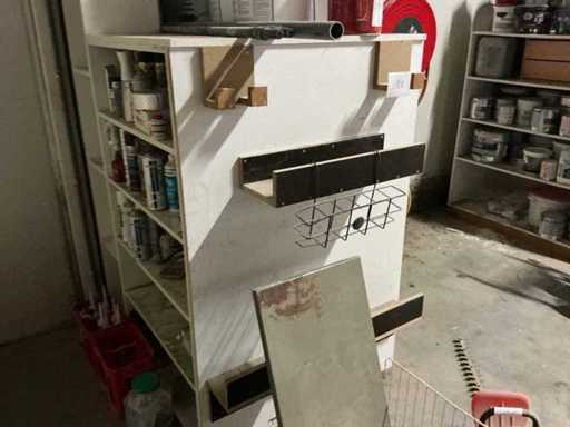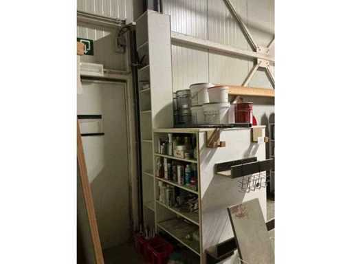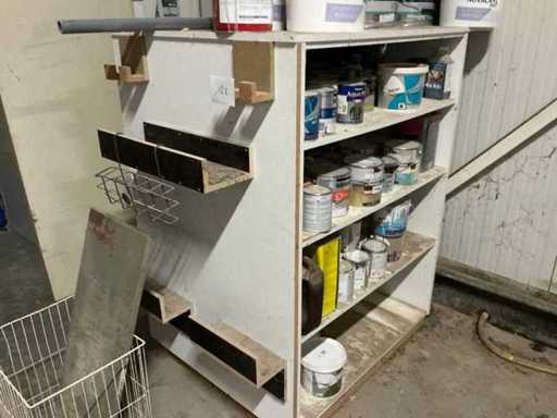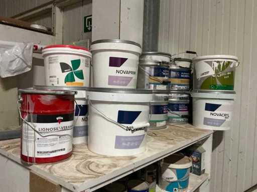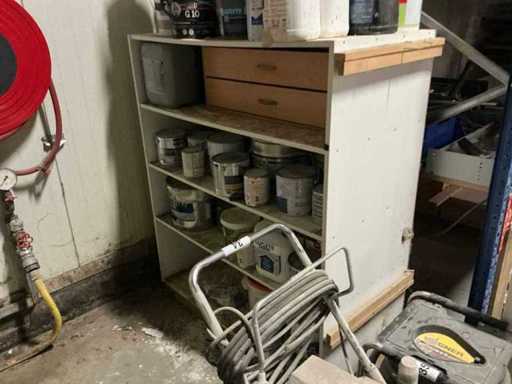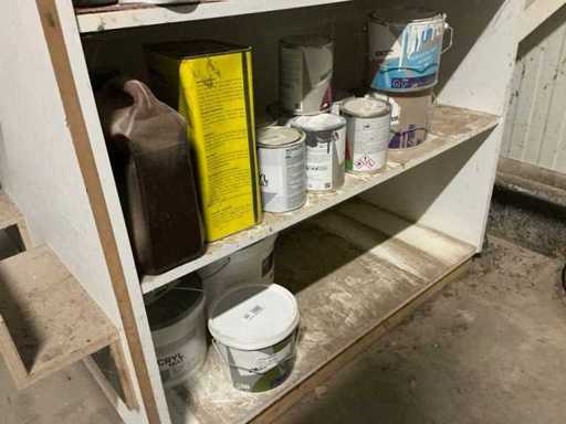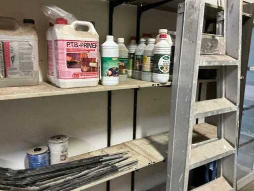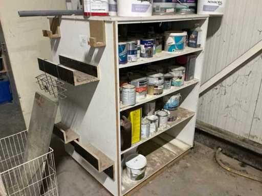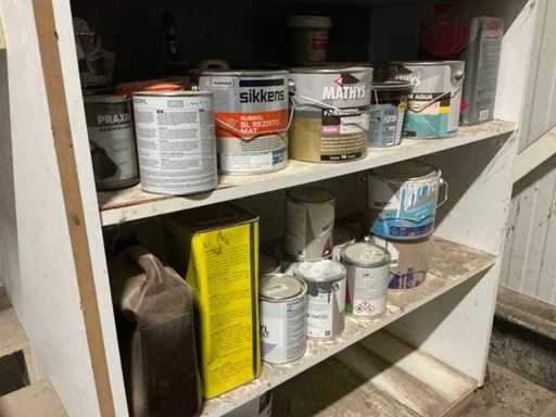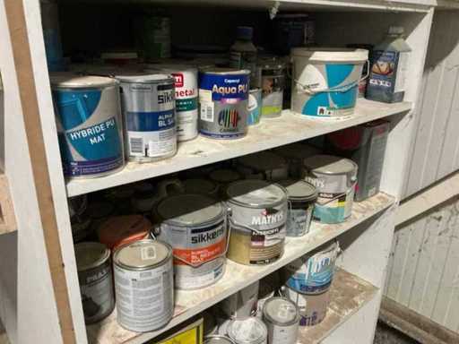 Met inhoud waaronder muurverf, lak, diverse sprays, siliconen en diverse vloeistoffen. Waaronder merken Novaprim, Sikkens, Mathys, Boss Paints, Ardex,…