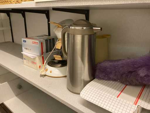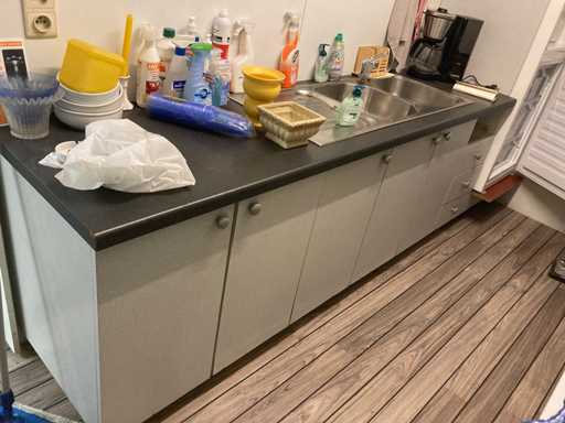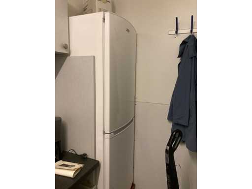 Keukentoebehoren : 1 ijskast met groot diepvries vak, 1 microgolf oven, 1 koffiemachine, thermos, handoeken, glazen en borden, wand opbergsysteem met planken (zelf te demonteren bij ophaling).
