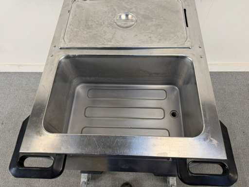 Voorzien van regelbare thermostaat, uitneembare inzetbakken en geplaatst op een verrijdbaar onderstel met zwenkwielen en legplateau.