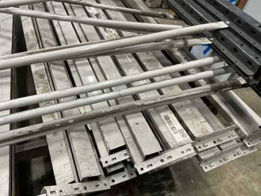 Voorzien van 6 staanders waaronder 4 met afmeting 1,20 x 2,40m en 2 x 90 x 2,40m, 16 liggers met lengte 2,30m, uitgezonderd kar