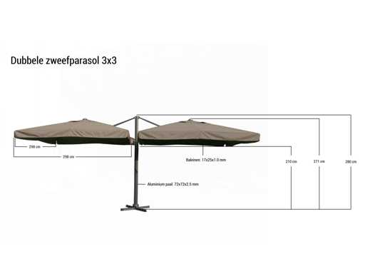 Type: U1073 DOUBLE 3X3 TAUPE LUX De parasol is ideaal voor gebruik in de tuin, terras en balkon. De grote parasol wordt geleverd met een parasolvoet. Deze moet wel worden verzwaard met behulp van bijvoorbeeld terrastegels. Houd hiervoor minimaal een gewicht van 100 kilo aan. Voorzien van: Groot parasoldoek met een afmeting van 2x ø300 cm - UV-bescherming van 50+ - Kleurvast doek - Sterk en stevig frame gemaakt van aluminium. - Eenvoudig startklaar te zetten voor gebruik. - Inclusief parasolvoet. - Brandvertragend, dik doek (300 grams) - De parasol houdt de warmte van de zon vast waardoor het ook ’s avonds nog lekker warm is wanneer de zon ondergaat. - De parasol kan 360 graden om zijn as draaien, zo kan de parasol makkelijk meedraaien met de zon en maak je optimaal gebruik van de parasol.