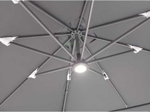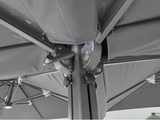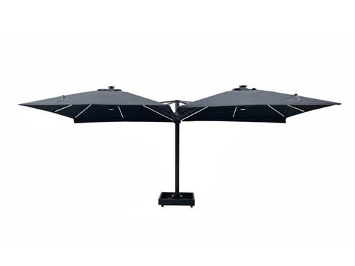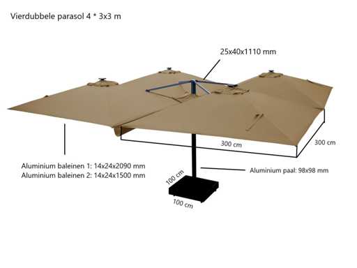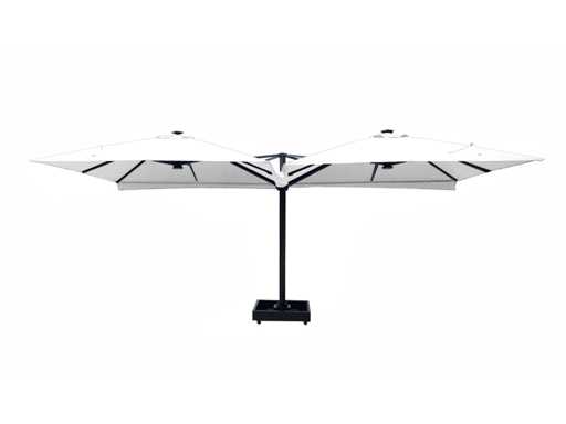 Type: U1075 QUATRE 3X3 WHITE De parasol is ideaal voor gebruik in de horeca en/of op een groot terras, tuin of binnenplaats. De parasol bestaat uit 4 parasols aan een frame en is voorzien van een grondanker. Exclusief verrijdbare parasolvoet: deze is los verkrijgbaar. Voorzien van: LED-verlichting onder het doek zodat het 's avonds ook nog goed vertoeven is onder de parasol. - Groot parasoldoek, 4 stuks, met een afmeting van ø300 cm. - Sterk en stevig frame gemaakt van aluminium. - Eenvoudig startklaar te zetten voor gebruik. - Brandvertragend, dik doek voor een betere UV-bescherming. - Ventilatie aan de bovenzijde van het doek. - De parasols zijn voorzien van een afritsbaar tussenstuk om de parasols te verbinden.