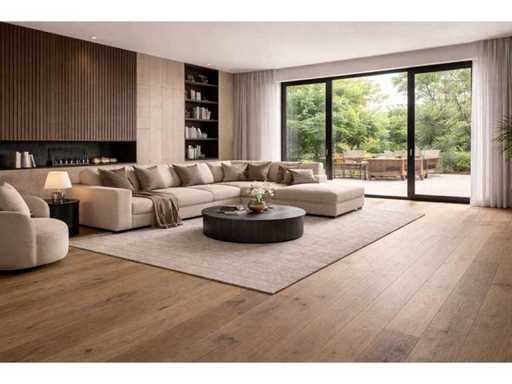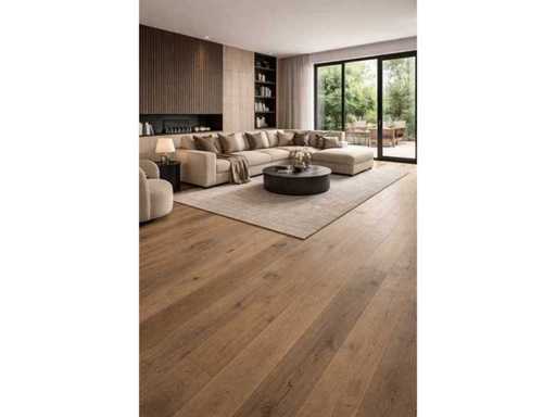 Europees eiken parket 1900x190x14/3mm, 3-laags technische vloer, T&G (tong & groef), gelakt, geschikt voor vloerverwarming, 1 pallet, ca. 900 kg gewicht