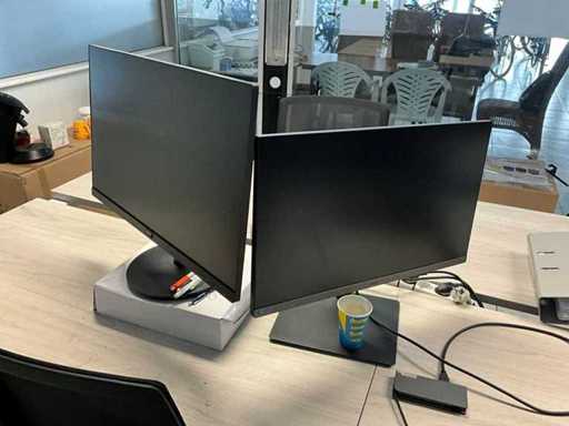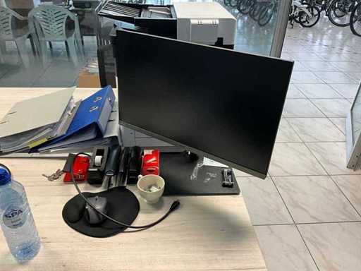 Bestaand uit 4x bureautafel met 4 bureaustoelen, printer Kyocera Ecosys M5526cdw, 3x computerscherm, koffiezet Senseo, stofzuiger Koenig, oproller verlengsnoer, electrische heater Blumfeldt