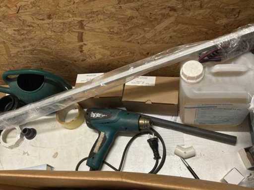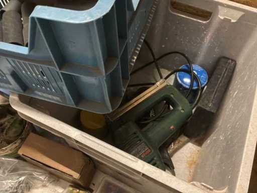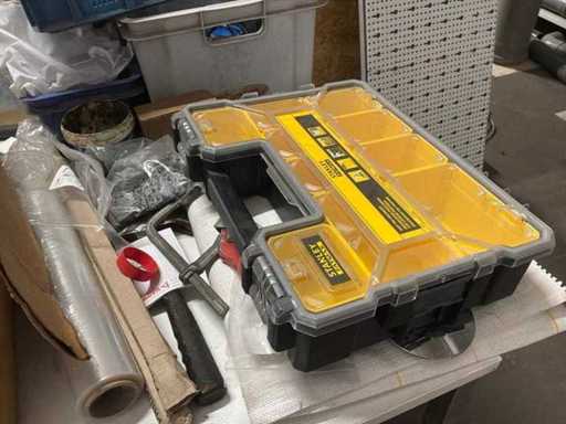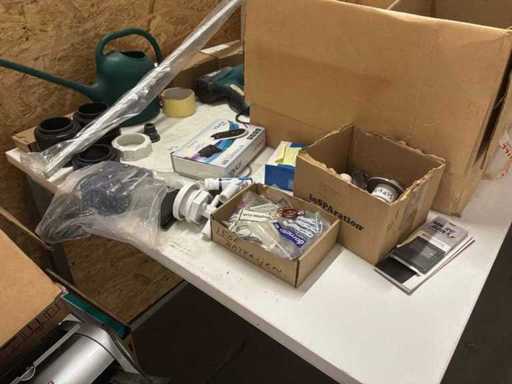 1 tafel, 1 pallet met diverse bureau artikelen, werkkoffer, diverse gereedschappen, …