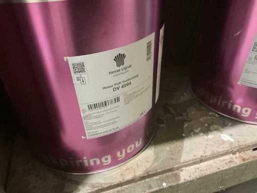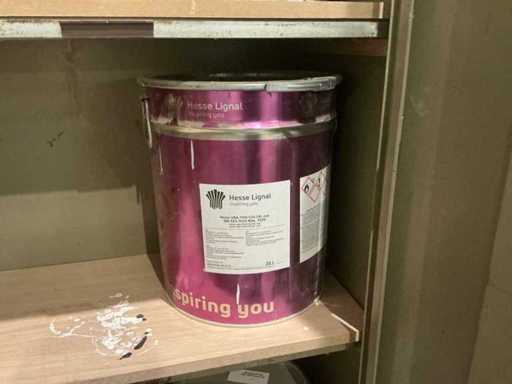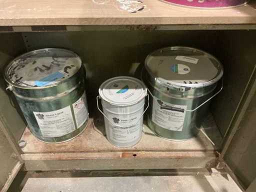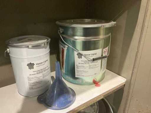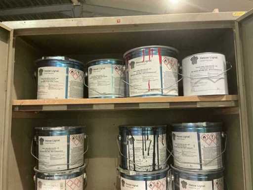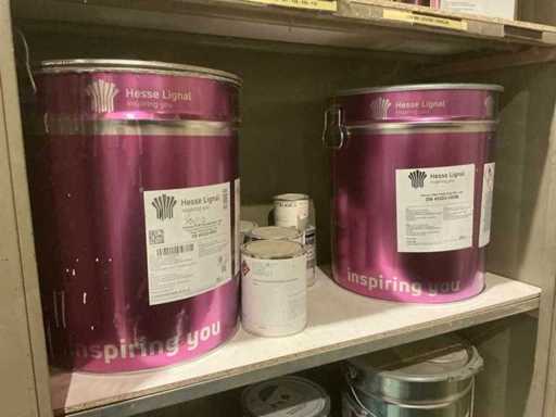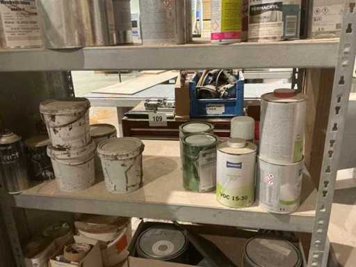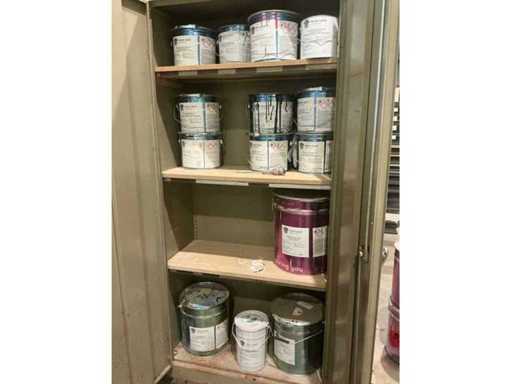 Waaronder partij diverse lakken, primers en Tinners Hesse Lignal 1L, 5L en 25L, waaronder aangesproken en ongeopend, liggende in 2 dossierkasten en rek (inclusief)