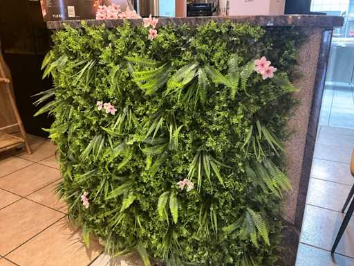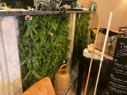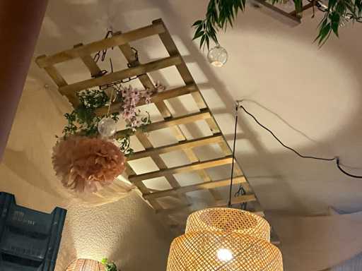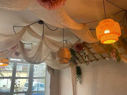 Waaronder plafonddecoratie voorzien van houten frame, diverse kunst planten en enige bloempotten met plant,
