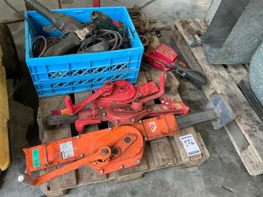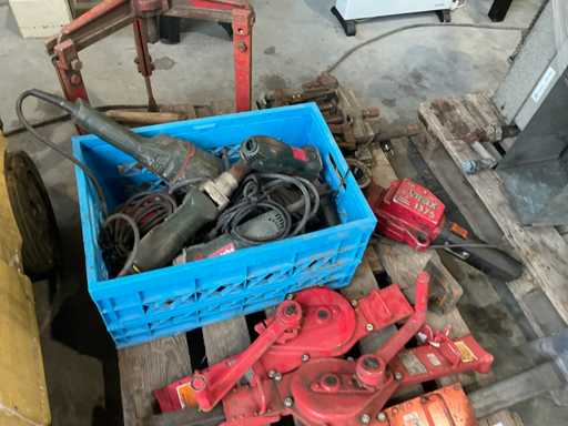 Waaronder opspangereedschap, haakse slijpers, 3 x dommekracht en wirax 1355 Elektrische draadsnijmachine