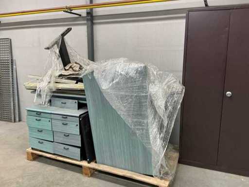 Bestaande uit 2 diverse archiefkasten, gedemonteerde bureautafel, koelkast