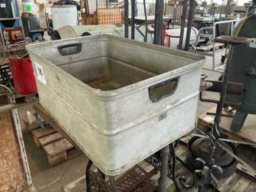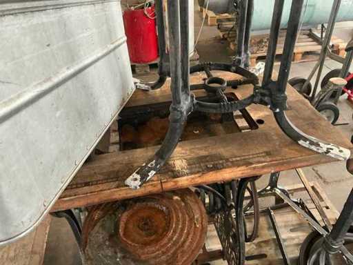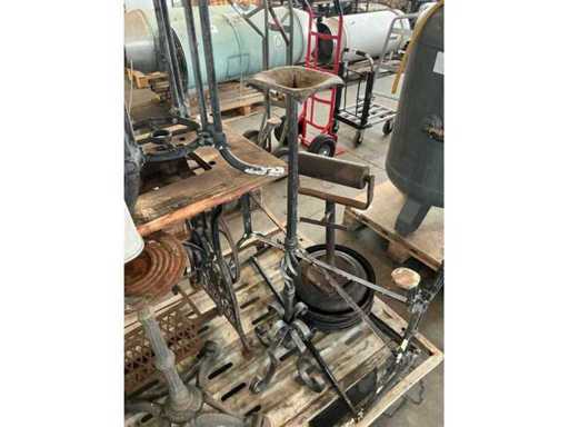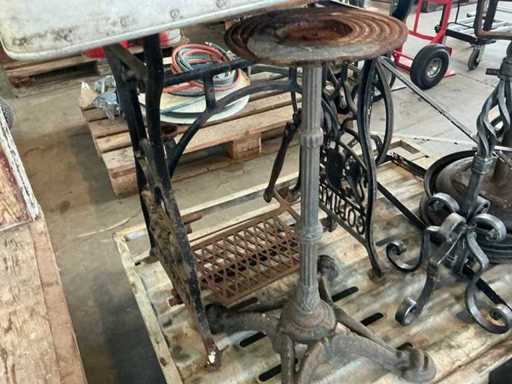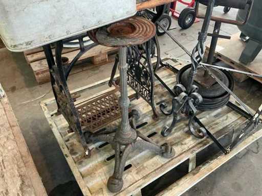 Waaronder 1x naaitafel voorzien van voetbediening, afmeting: 90x40x70cm, gietijzeren kaarshouder 105cm, 2 diverse onderstellen en afrolelement op voet, compleet met metalen bak Gmöhlin 65x40x25cm