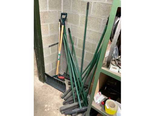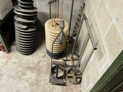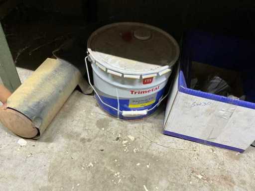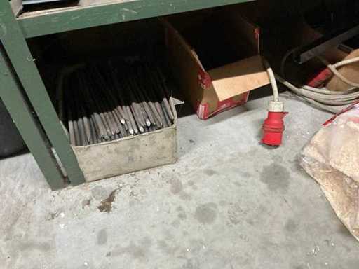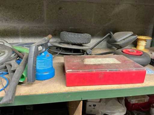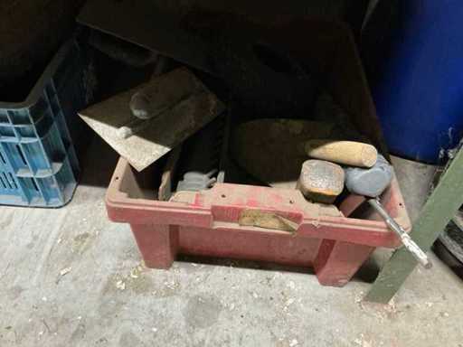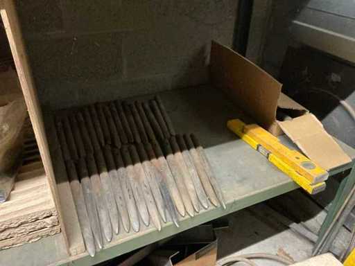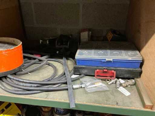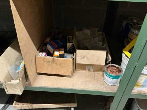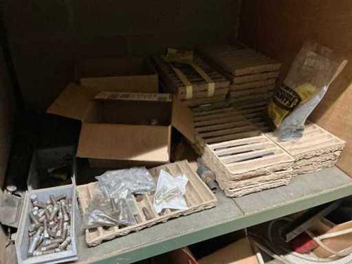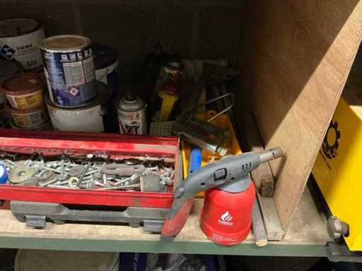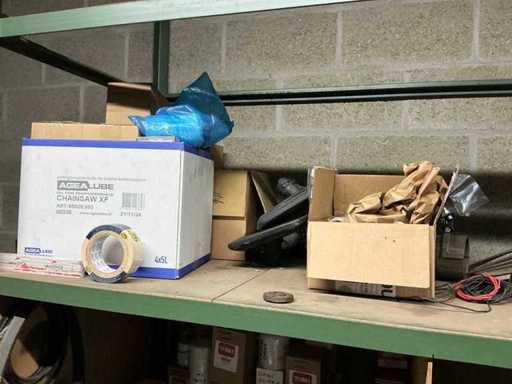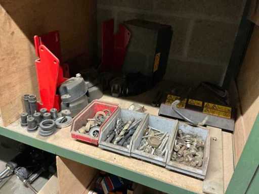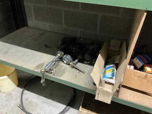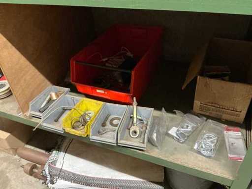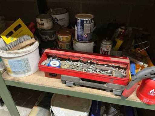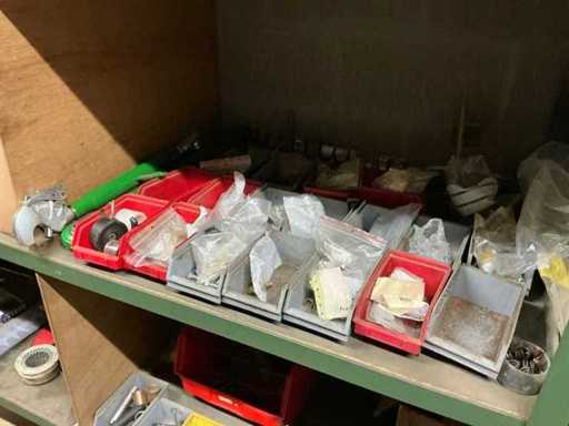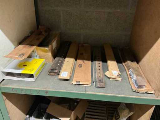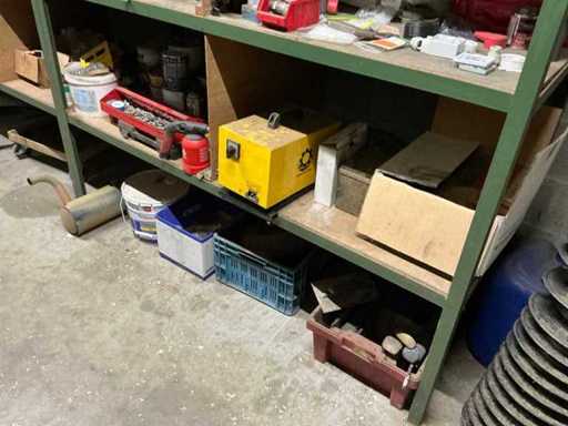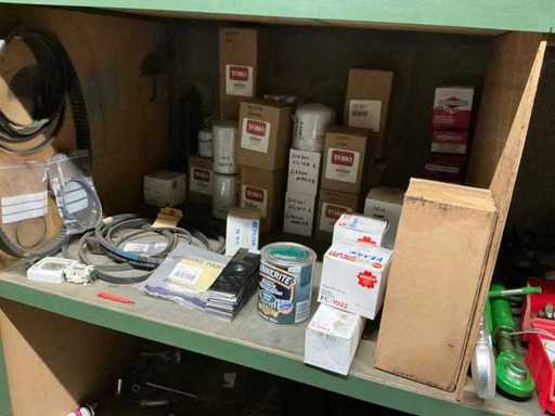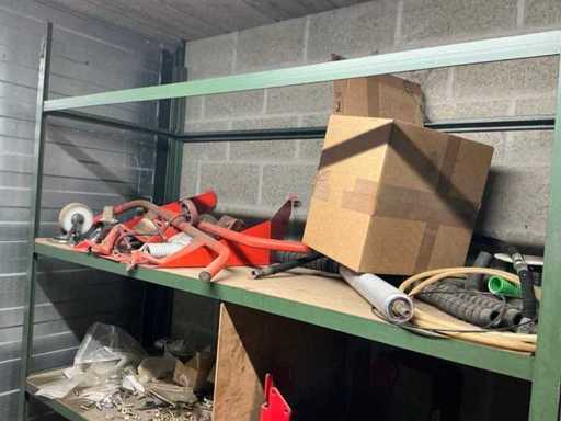 waaronder filters, aandrijfriemen lagers, maaimessen, ….. zijnde volledige inhoud lokaal, inclusief 4 gelaste legbordrekken 70x180xH247cm, koper dient alles mee te nemen