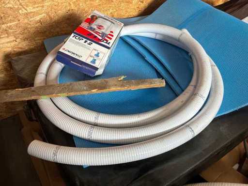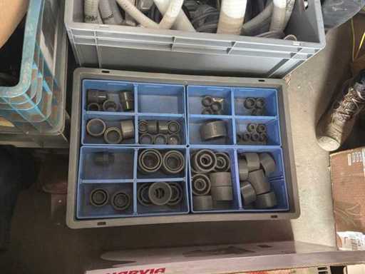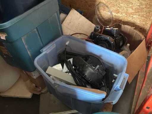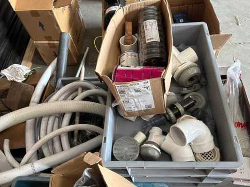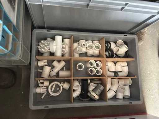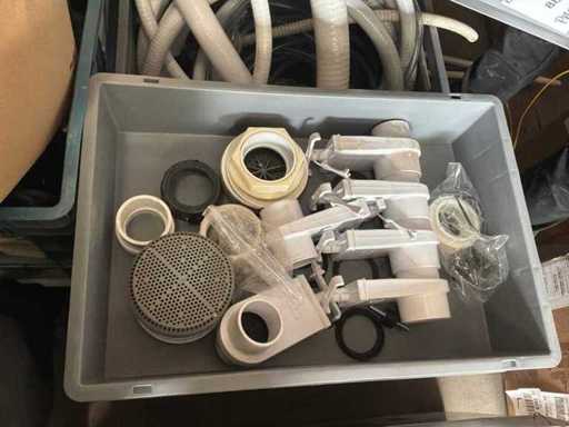 Pomp, ledcontroller, pvc onderdelen, verdeeld over diverse plastiek bakken, zandfilter