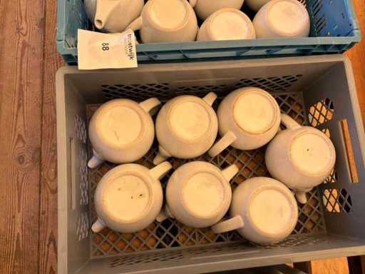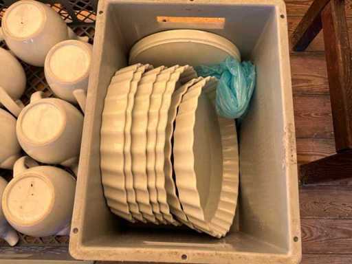 3 kisten met inhoud. Waaronder 14x koffiekan zonder deksel en 7x taartvorm