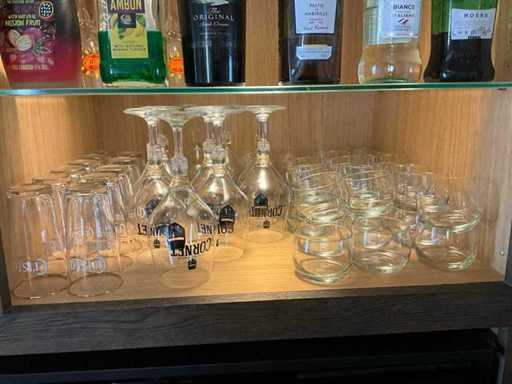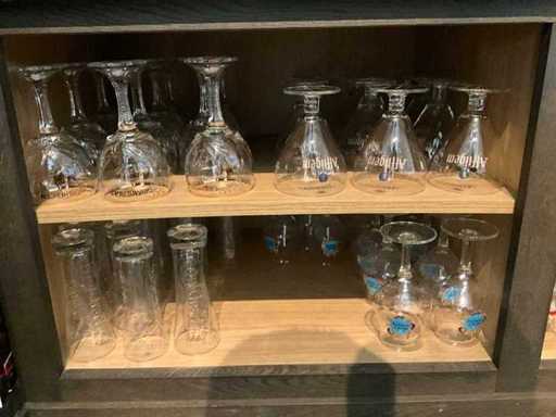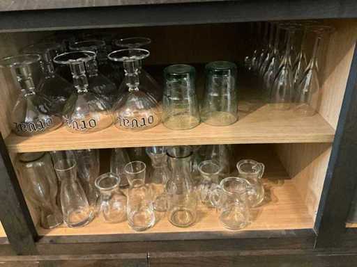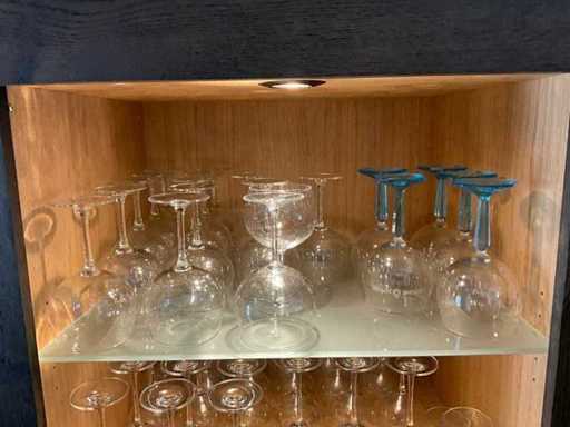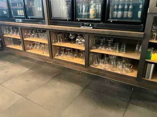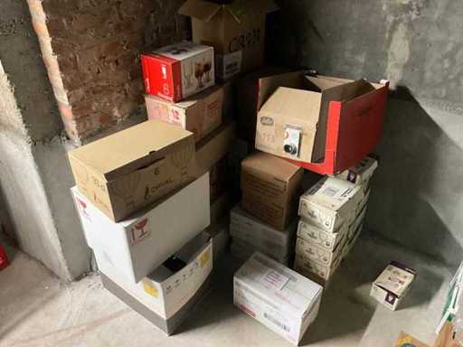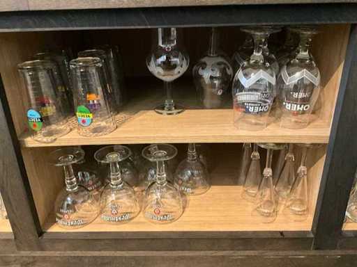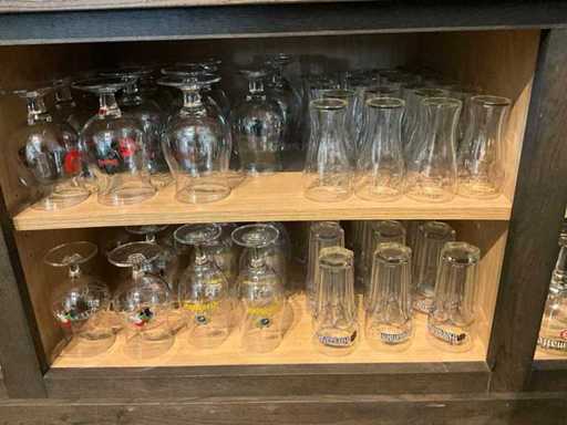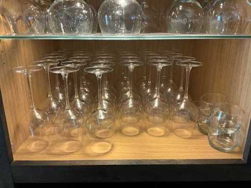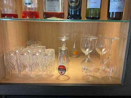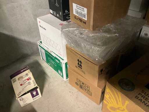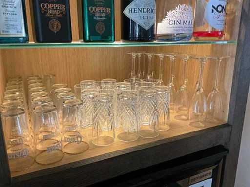 Waaronder diverse bier- wijn- water- champagneglazen en longdrinks, compleet met enige theeglazen en frisdrankglazen. Aangesproken dranken niet inbegrepen. Enkele dozen zich bevindend in kelderruimte inbegrepen.