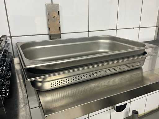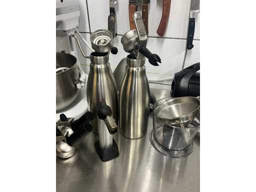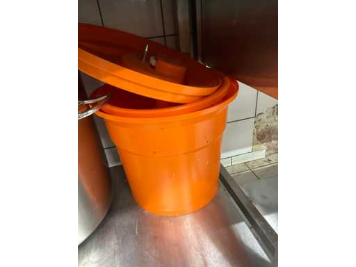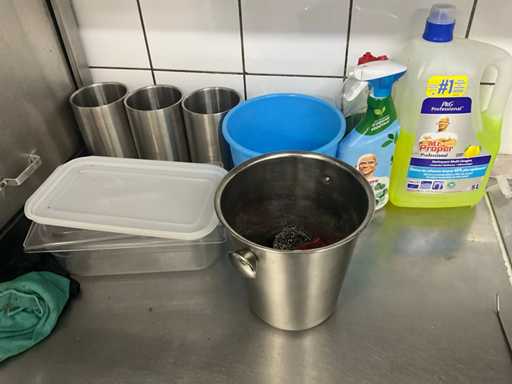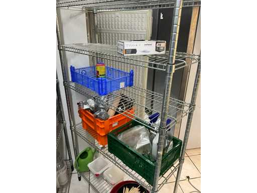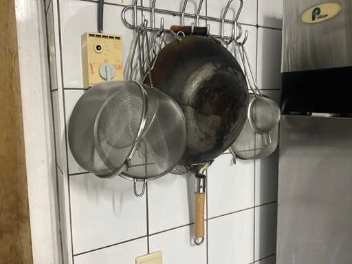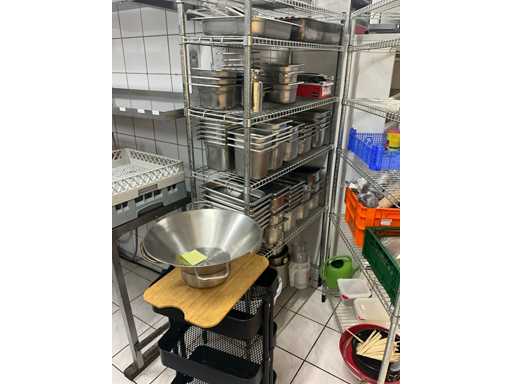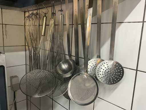 Waaronder 5 diverse keuken messen, 7 Gardes, 6 schuimspanen, 2 pollepels, 1 grote industriële kunststof slazwierder, 7 diverse kunststof snijplanken, 6 zeven en enige diverse mengkommen, Waaronder liggende in 2 metalen opbergrekken voorzien van 6 leggers, Afgifte volgens aanwijzing, uitgezonderd genummerde kavels