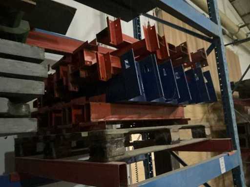 Bestaande uit palletstelling met 2 staanders en 4 liggers. Oude langbandschuurmachine Concord. Zware hydraulische hefunit. Oude toupi. Mobiel frame. 2x rollenbaan