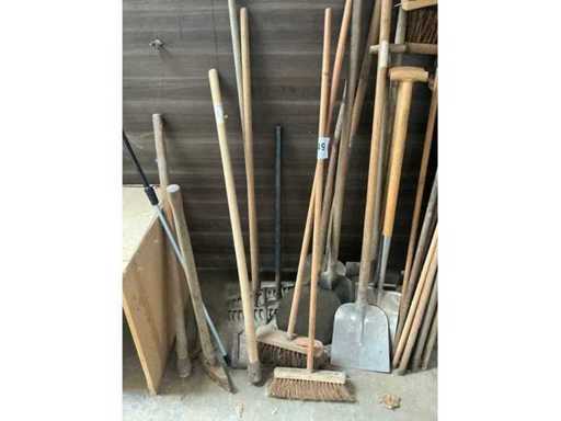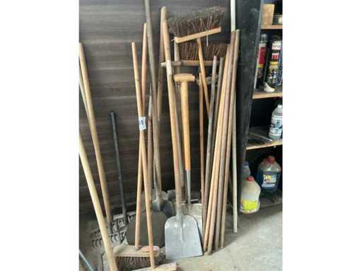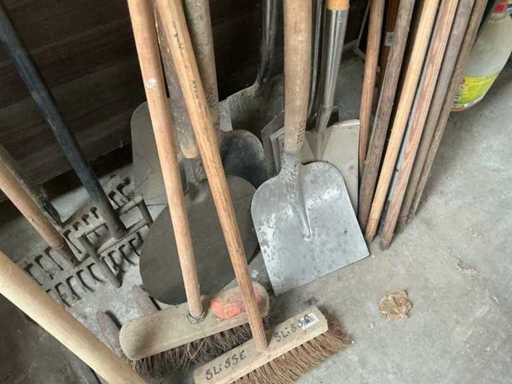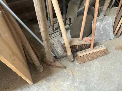 Waaronder 7 schoppen, 2 harken, 1 bijl, 5x borstel, diverse houten stelen,…