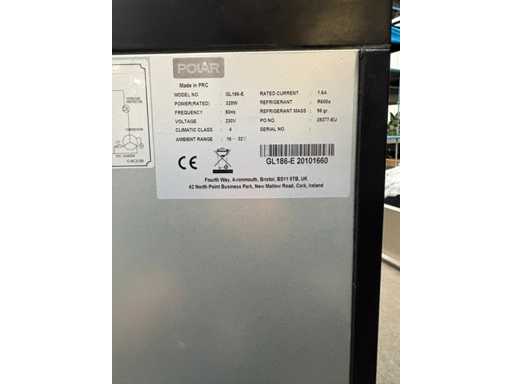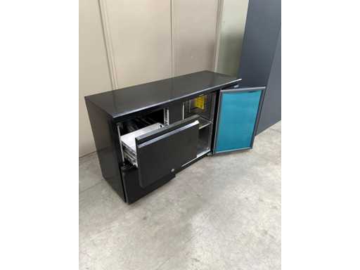 Professionele gekoelde werkbank van het merk POLAR, uitgevoerd in een zwarte behuizing met inox binnenzijde. De werkbank is voorzien van twee gekoelde lades, één gekoelde deur en een geïntegreerde koelunit aan de rechterzijde. Geschikt voor horeca- en bargebruik (voorbereiding en gekoelde opslag).