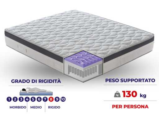 Belangrijkste kenmerken (samenvatting) Het Positano – Calypso matras is een pocketveermatras dat anatomische ondersteuning biedt. De veren zijn individueel gecoat met TNT De "MyMemory" traagschuimlaag is 7 cm dik, de totale dikte is ongeveer 27 cm. De veren zijn 14 cm hoog en de containmentbox heeft een totale dikte van 4 cm. De veren zijn gemaakt van gefosfateerd stalen draad. Het reguleert de temperatuur dankzij de opencelstructuur van traagschuim en veren die de luchtcirculatie bevorderen. Hypoallergeen, antibacterieel en anti-huisstofmijtmateriaal, 2 cm hypoallergene vulling en ademende 3D-band Polyurethaanschuim opslagdoos Het vormt zich op basis van lichaamswarmte en druk. Volledig gemaakt in Italië