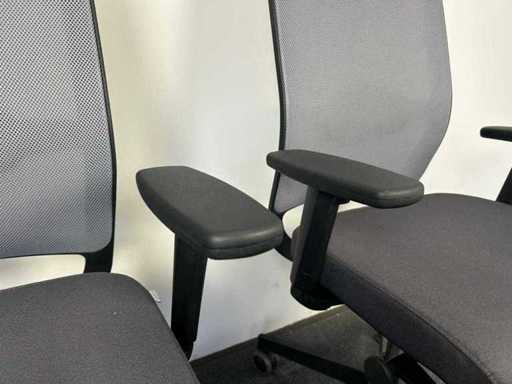 Duo van Profim bureastoelen in het grijs, verstelbaar met mesh rugleuning. Met gebruikssporen, staat kan variëren per item.