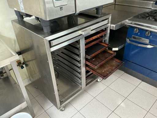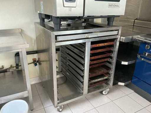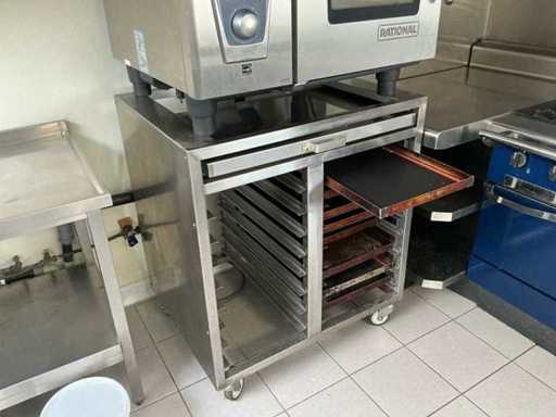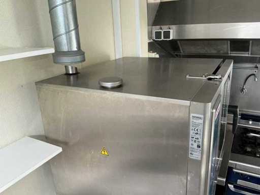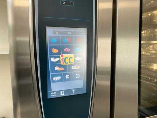Voorzien van: Rational, type: SelfCookingCenter SCC 61, capaciteit: 6 x GN 1/1, aantal niveaus: 6 inschuifrails, aansluiting: 400V (3-fase), vermogen: ± 10 – 11 kW, digitaal display met centrale draaiknop, functies: hetelucht -stomen- combinatie (stoom + hetelucht), automatische reinigingsprogramma’s, bakken, braden, stomen, regenereren, sous-vide toepassingen, volledig RVS, dubbelglas met ventilatie, automatische vochtregeling, afmetingen breedte: ± 85 cm, diepte: ± 77 cm, hoogte: ± 78 cm, gewicht: ± 100 – 120 kg, inclusief onderkast met 8 baklade's, afmetingen onderkast breedte 900mm, 740mm, 1030mm hoog, met 8 baklade’s, werking getest, uitschuifbaar werkblad in RVS.