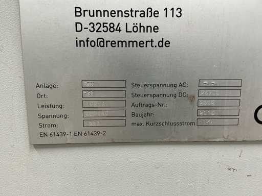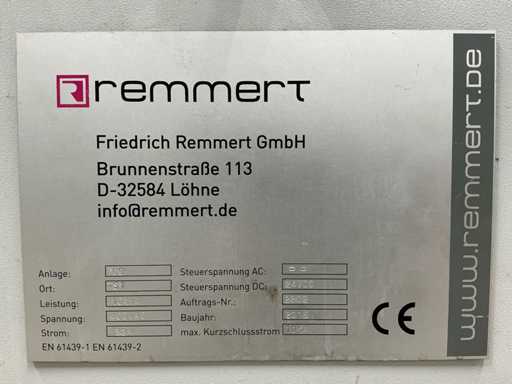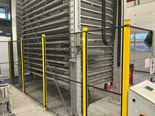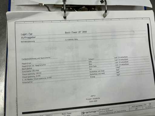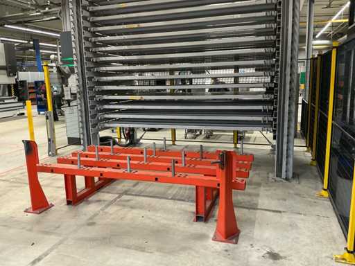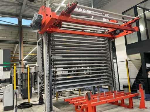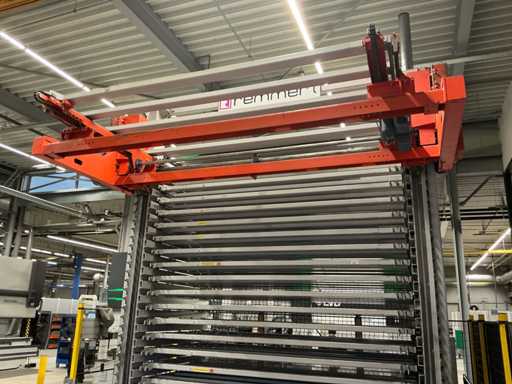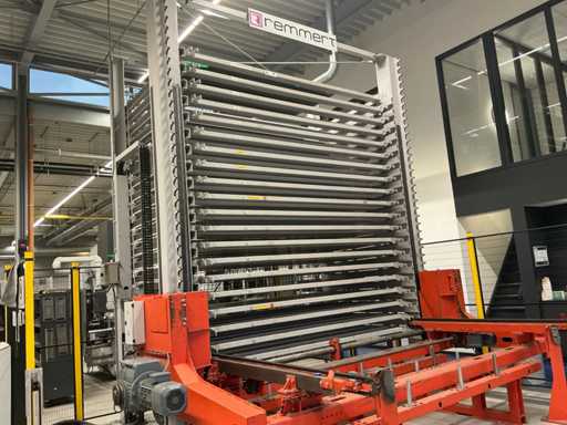 Voorzien van: vacuüm heffer, uitwerpframe, FLEX vorkheftruck, volautomatisch platenmagazijn. De Remmert automatische plaatopslaginstallatie (bouwjaar 2015) bestaat uit een 20-lades toren voor plaatformaten 3000 × 1500 mm (3015-formaat), met een laadcapaciteit: elke lade (of “opslagplaats”) kan tot 3000 kg dragen, een Siemens PLC-besturing met touchpanel, een vacuümheffer, werkt op 400 V / 32 A. De machine heeft een geschatte installatiehoogte van circa 4-5 meter, een breedte van ongeveer 5 meter en een diepte van circa 4 meter (afhankelijk van opstelling).