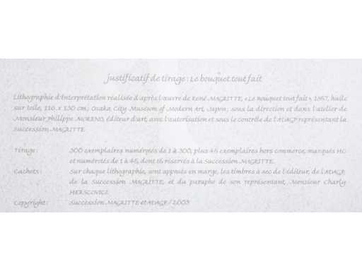 lithografie naar het werk van René Magritte 'Le bouquet tout fait’ uit 1957 - Voorzien van de droogsptempel van ADAGP en van de Succession Magritte alsook de paraf van Charly Herscovice - Betreft het grootste uitgegeven formaat van de reeks naar Magritte