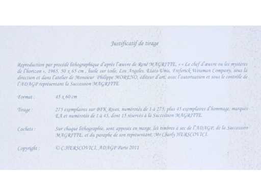 Lithografie naar werk van René Magritte, Voorzien van de droogsptempel van ADAGP en van de Succession Magritte alsook de paraf van Charly Herscovice