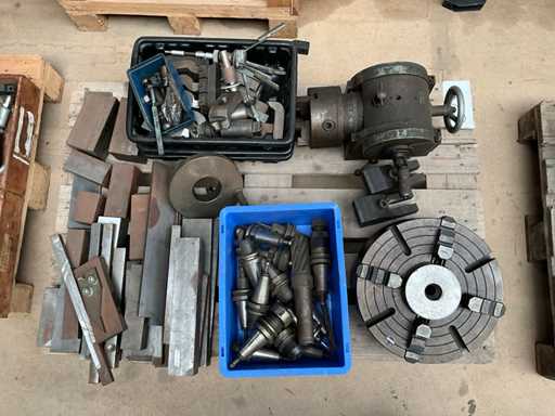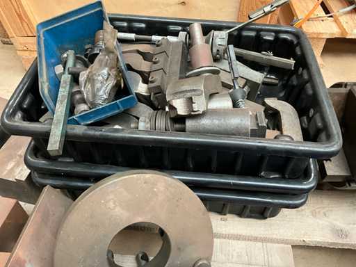 Waaronder 4 diverse draaibankklauwen, gereedschapshouders, en diversen liggende op 2 pallets.