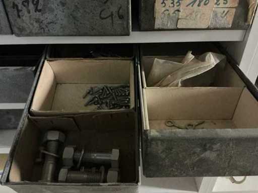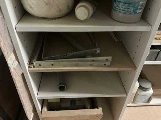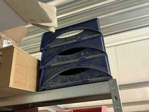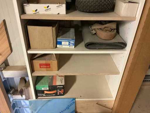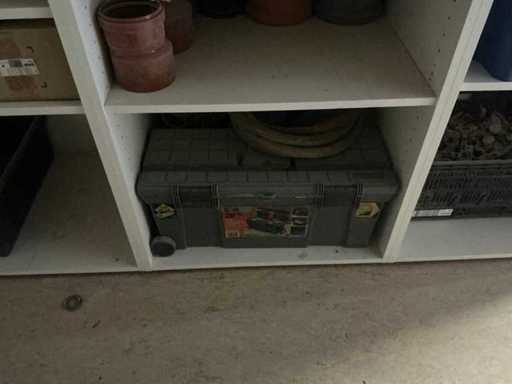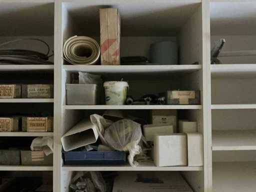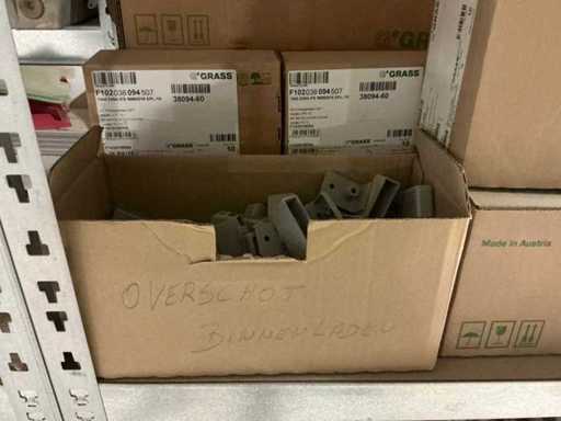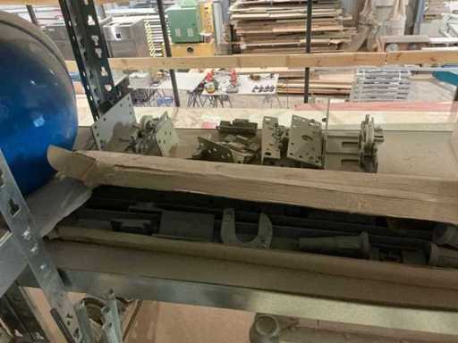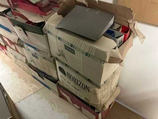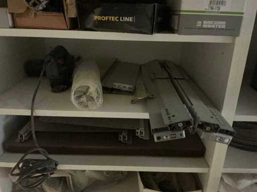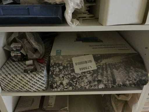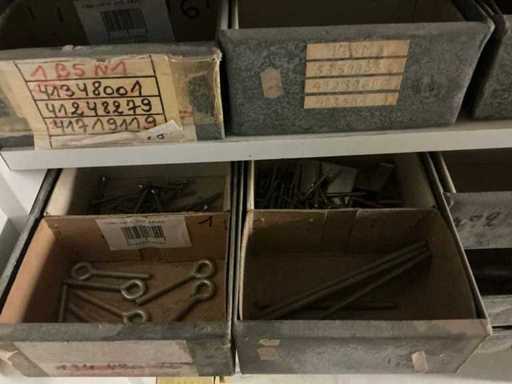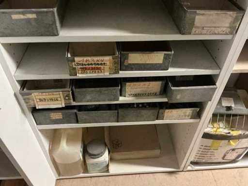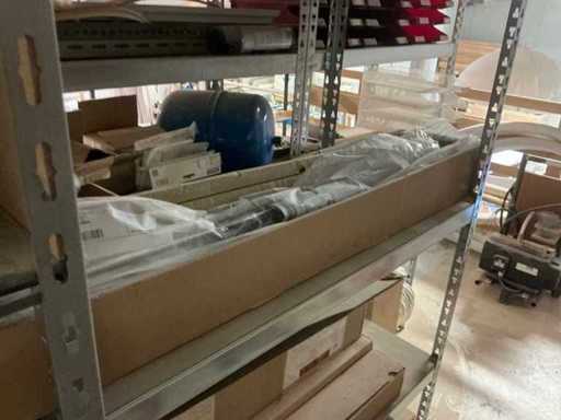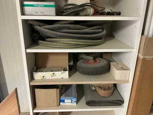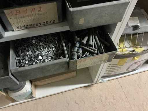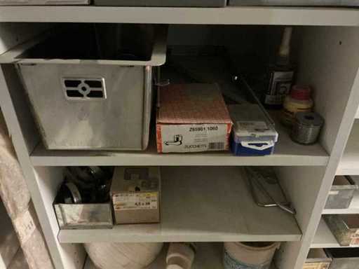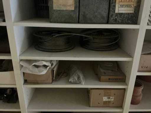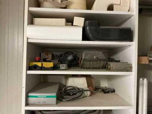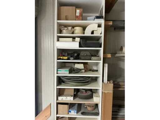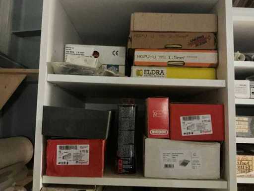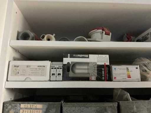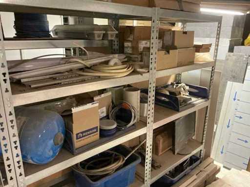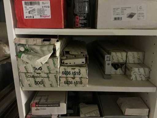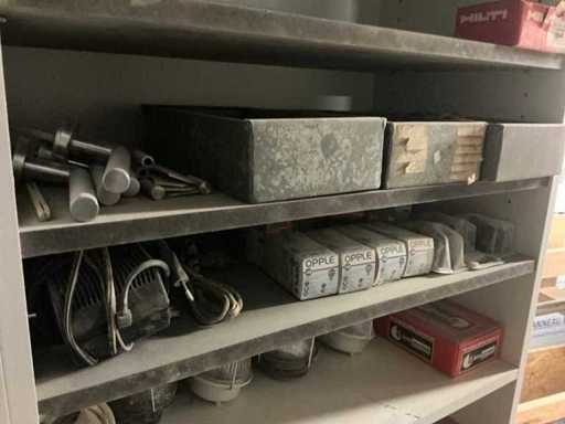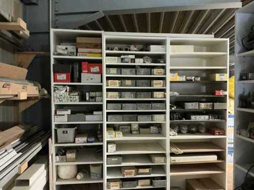 Waaronder partij diverse lampen, bevestigingsmaterialen waaronder schroeven, bouten, klemmen, partij deurbeslag waaronder scharnieren, schuifrails, regenwaterfilter Braukmann, partij elektriciteitstoebehoren, railsystemen, contactdozen, partij (versneden) pvc platen in diverse afmetingen, partij diverse mappen, diverse tafelpoten, verstelbare kastvoeten,..,liggende in 8 diverse kasten voorzien van diverse leggers met afmeting: 70x56x222cm (inclusief), uitgezonderd genummerde loten